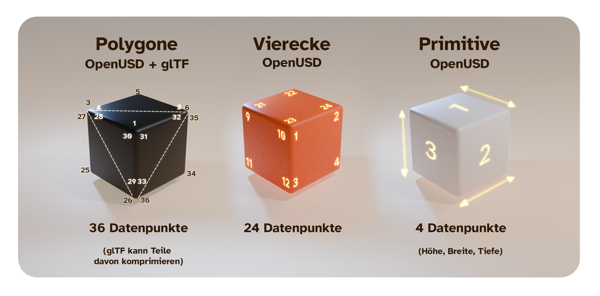 Ein Beispiel dazu: Ein Würfel besteht aus sechs Seiten. Dazu muss ich bei vielen Datenformaten jede Seite mit zwei Dreiecken beschreiben. Jedes Dreieck hat DREI Datenpunkte / Ecken im 3D-Raum. Ergibt in Summe 6 x 2 x 3 = 36 Datenpunkte. OpenUSD kann hingegen einfach „Würfel, Höhe, Breite, Tiefe“ verarbeiten, lediglich vier Datenpunkte für ein „USD-Primitiv“, ganz ohne weitere Komprimierung, denn DIES ist die datensparsamste Art der Objektbeschreibung. Datensparsamkeit ist eines der obersten Gebote dieses Formats.