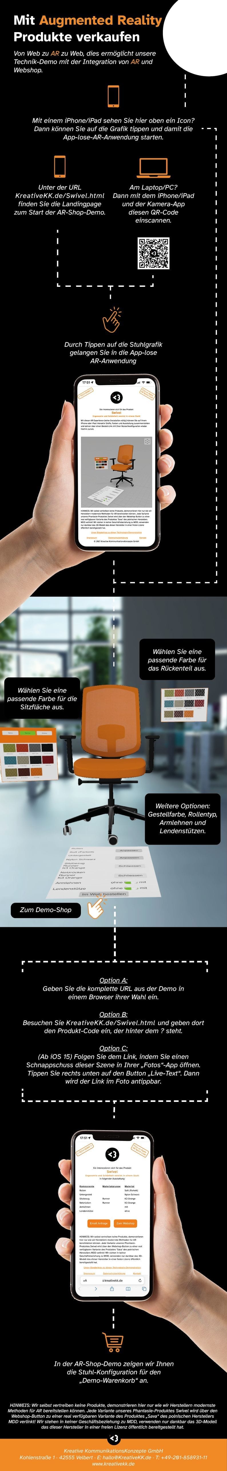 Stell dir folgendes Szenario vor: Du bist auf der Suche nach einem neuen Bürostuhl und landest auf der Website eines Bürostuhlherstellers. Dort gibt es aber nicht nur Produktfotos oder ein Video, sondern auch ein einladendes AR-Symbol. Dies sorgt dafür, dass dein iPhone/iPad sofort eine kleine Datei (keine App) herunterlädt, wodurch der iOS-AR Modus aktiviert wird. Mit diesem Modus kannst du dir deinen Wunschstuhl konfigurieren. Und nicht nur das, er erscheint direkt vor dem Schreibtisch oder wo immer du gerade bist! Dir gefällt der Stuhl? In AR erscheint ein zu deiner Konfiguration passender Link, mit dem du bestellen oder mehr erfahren kannst. All das GEHT – und wir beschreiben hier WIE.